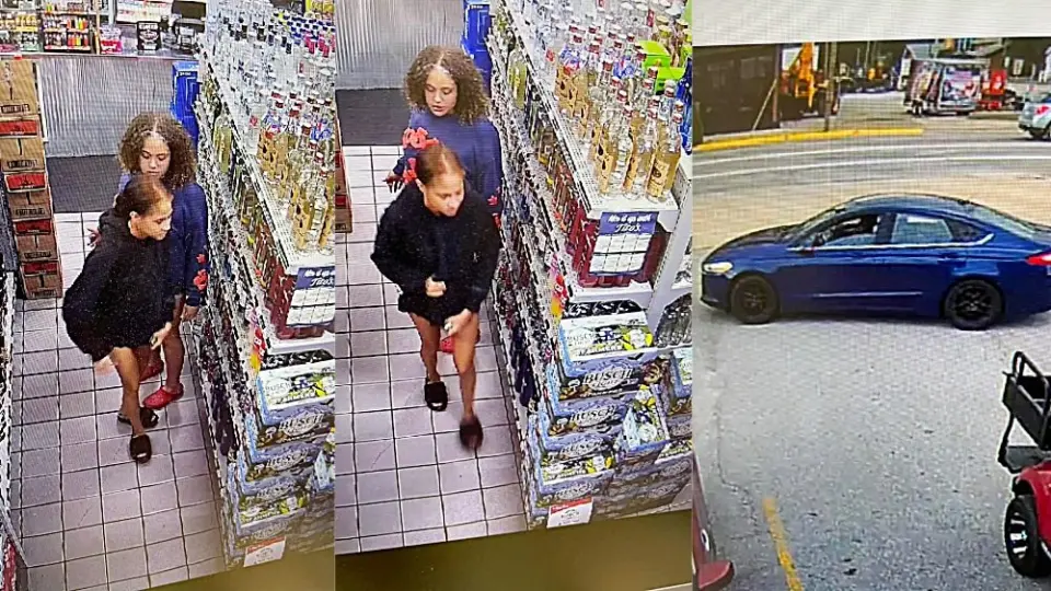 Security footage showed a dark blue Ford sedan pulling into the east side of the parking lot before driving around the west side and backing into a parking space. Two women got out of the back of the car and walked into the store together. Both suspects appeared to have dark complexions, possibly of mixed African-American and Caucasian descent, and seemed to be in their late teens or early 20s.