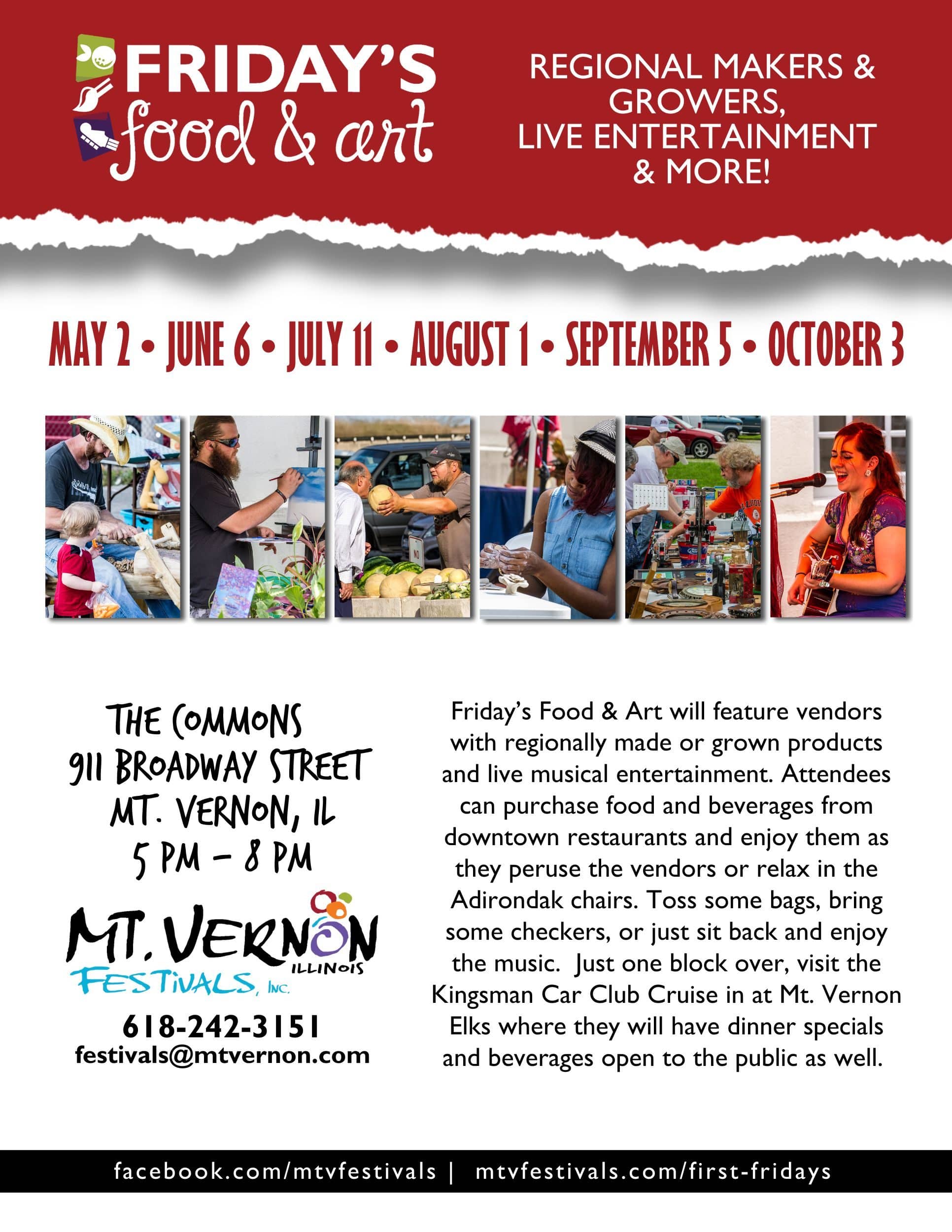 Friday’s Food & Art will take place on the first Friday of every month from 5:00 – 8:00 pm, May to October, at The Commons in downtown Mt. Vernon, Illinois. Hosted by Mt. Vernon Festivals, Inc., this vibrant event will showcase local vendors offering regionally made or grown products, along with live musical entertainment. Attendees can enjoy delicious food and beverages from nearby downtown restaurants, either while browsing the vendors or relaxing at the picnic tables and listening to the music. It’s the perfect setting to reconnect with old friends or unwind after a busy week. Just a block away, stop by the Kingsman Car Club Cruise-In at the Mt. Vernon Elks, where you’ll find dinner specials and drinks available to the public.
