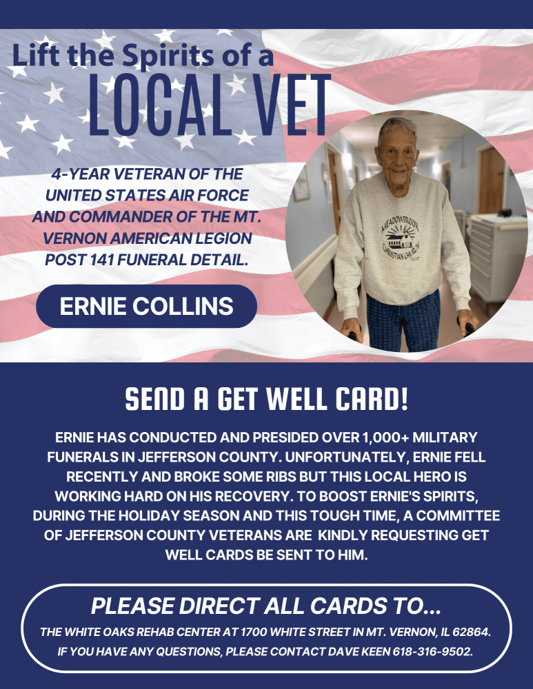 Ernie Collins is a 4-year Veteran of the United States Air Force and Commander of the Mt. Vernon American Legion Post 141 Funeral Detail. Ernie has conducted and presided over 1,000+ military funerals in Jefferson County. Unfortunately, Ernie fell recently and broke some ribs but this local hero is working hard on his recovery. To boost Ernie’s spirits, during the Holiday Season and this tough time, a committee of Jefferson County Veterans are requesting get well cards be sent to him at the White Oaks Rehab Center located at 1700 White Street in Mt. Vernon, IL 62864. If you have any questions, please contact Dave Keen 618-316-9502.