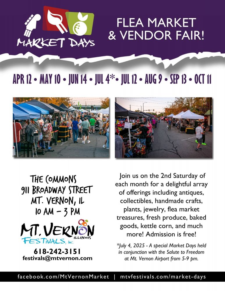 Discover Mt. Vernon’s vibrant community spirit at Market Days, the city’s premier flea market and vendor fair. Held at The Commons, 911 Broadway St., Market Days takes place on the second Saturday of every month from 10:00 am – 3:00 pm, April through October. Join us for a delightful array of offerings including antiques, collectibles, handmade crafts, plants, jewelry, flea market treasures, fresh produce, baked goods, kettle corn, and much more! Admission is free, and vendor fees are kept affordable, making it a fantastic outing for all. Don’t miss out – come visit, shop, and immerse yourself in the festive ambiance of Market Days in Mt. Vernon, Illinois!
