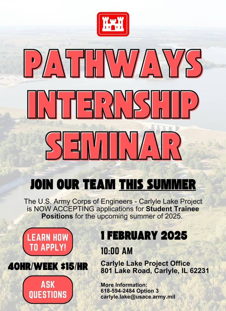 The U.S. Army Corps of Engineers – Carlyle Lake Project is pleased to announce the opening of applications for multiple Pathways Internship positions for the upcoming recreation season. This initiative is designed to attract dedicated individuals who plan to or are actively pursuing a career in Natural Resources, Biological Sciences, Outdoor Recreation, Law Enforcement, Communications, Agriculture, or related fields. A seminar to learn more about these positions, answer questions, and learn how to apply through USA Jobs will be held at 10:00 AM on Saturday, February 1, 2025, in the Carlyle Lake Project Office at 801 Lake Road Carlyle, IL 62231.