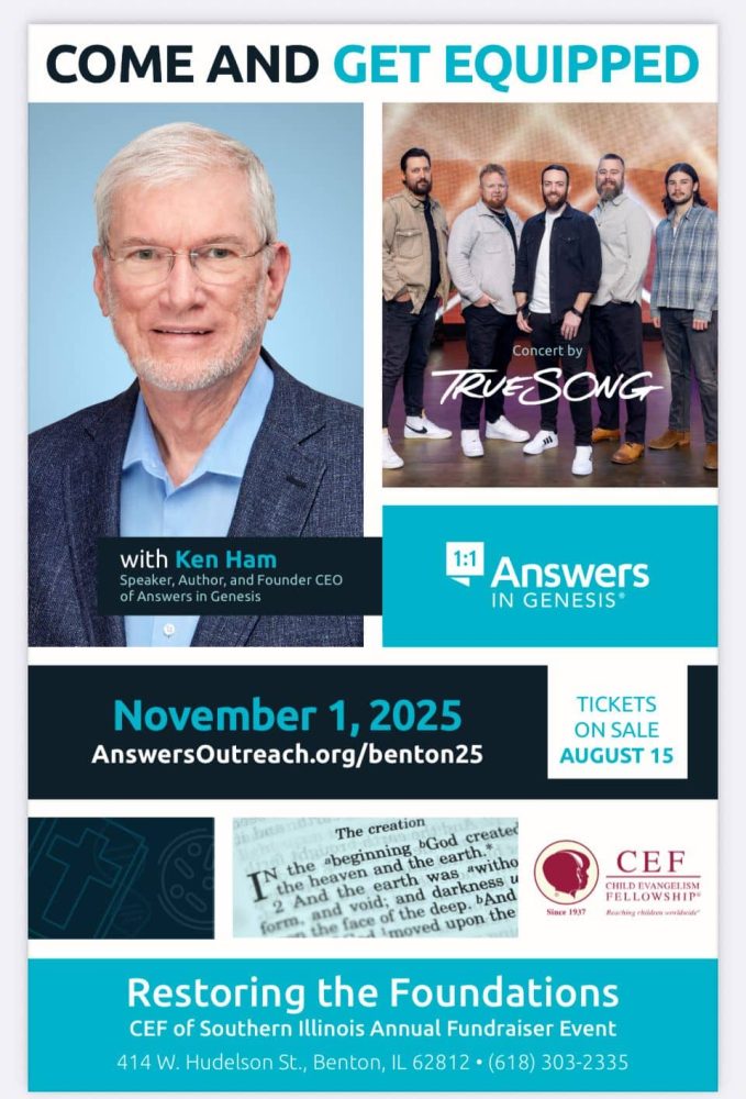Speaker, author, and Founder CEO of Answers in Genesis, Ken Ham and TrueSong, the resident artist band at the Ark Encounter, will be welcomed to the stage on November 1, 2025 at 6:00 PM. The evening entitled “Restoring the Foundations” will be a special fundraiser for Child Evangelism Fellowship of Southern Illinois held at the Benton Civic Center (414 W. Hudelson St., Benton, IL 62812). Tickets can be purchased online at www.bentonciviccenter.com/events.